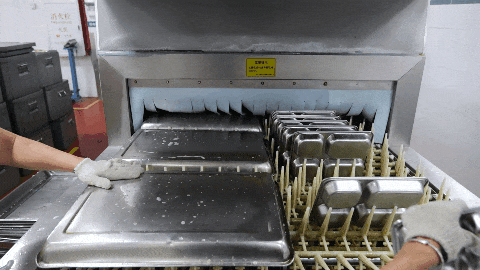 3.餐具回收流程 工作人員回收餐具,碼放整齊,統一處理。 4.洗消區域 餐具經過浸泡、漂洗、烘干等一系列標準化操作后,放入消毒柜進行高溫消毒。