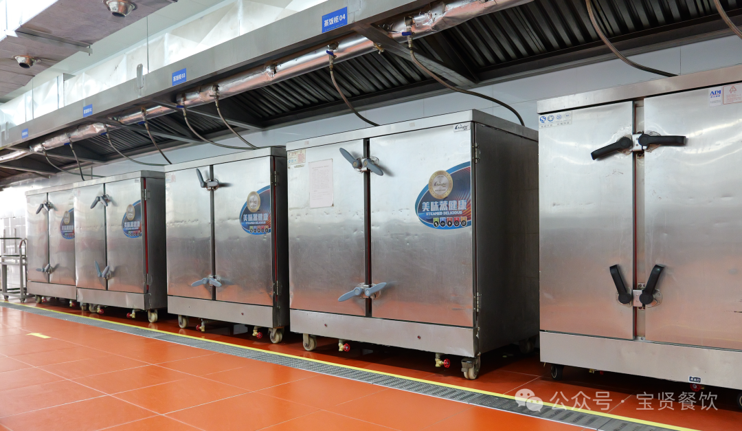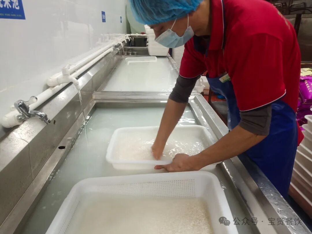 除了大型炒菜機器人外,人工炒菜的廚師班組均是業界精英,行政總廚和烹調組長具備一級/高級技師中式烹調師證,而且擁有多年營養配餐經驗。 2.蒸飯區 五常大米與桂一典一級大米按1:2比例進行勾兌(口感更有嚼勁),把泡米筐放到PH9.0還原水的洗米池浸泡40分鐘。