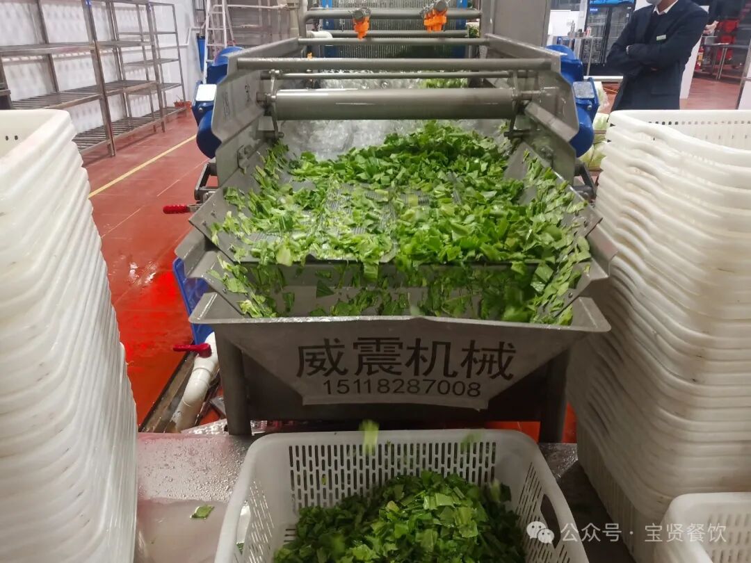 寶賢央廚的凈菜加工,主要分為三大板塊:葉菜、根莖、肉類。 1.葉菜加工 寶賢央廚配備了大型全自動化凈菜加工生產線,可對果蔬進行挑揀、分級、清洗、切分、二次清洗、保鮮、殺菌等全自動化、連續性操作,容量大、工作效率高,不僅極大地降低人工成本,而且對果蔬傷害小。