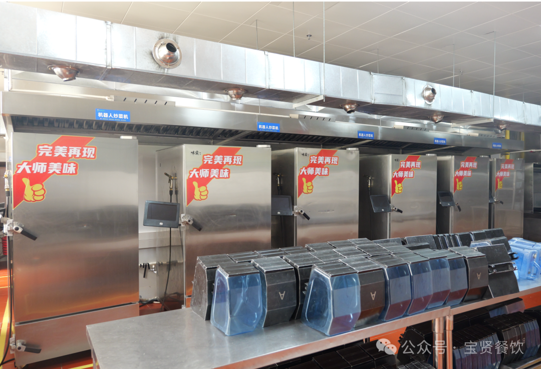 寶賢央廚配備6臺大型炒菜機器人,每臺機器平均7分鐘完成一道菜(烹飪效率高),炒一鍋的份量可供150人(產量大),一人可操作6臺炒菜機器人(降低人工成本)。