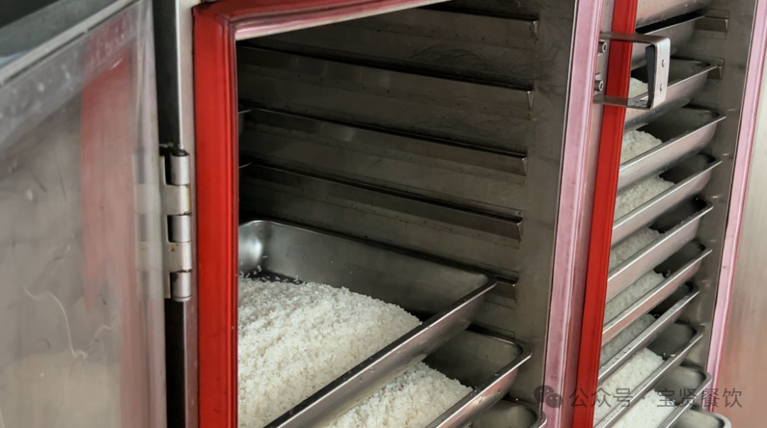 浸泡完成后,盛起瀝干水分備用,再經過一次人工清洗后,用PH9.0還原水按1:0.8的比例進行分裝(8斤米配6.4斤PH9.0的還原水)。 入柜上汽蒸40分鐘后關閉蒸柜的氣閥(中途不得打開柜門),燜上10分鐘后打開柜門進行下一步工作。