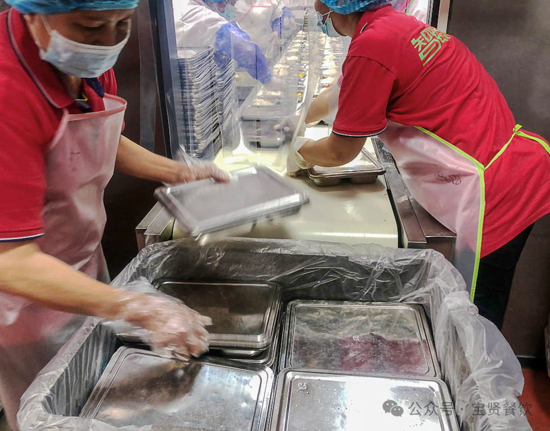 2.打包區 分餐人員將消毒好的餐具整齊擺放在三條分餐線的打餐臺上,流水線操作,快速出餐,確保食物溫度保持在60℃以上儲存和運輸。